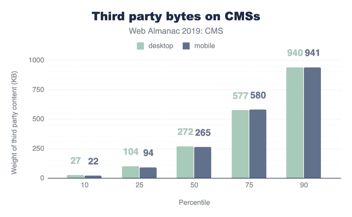 中央値は、少なくとも半分のCMSウェブページが、ここで報告している値よりも多くのサードパーティのリソースを提供していることを示しています。90パーセンタイルではCMSページは約940KBで52のリソースを配信できますが、これはかなりの増加です。