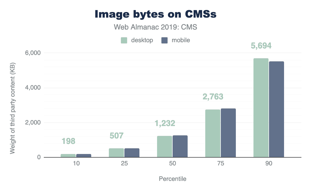 CMSのページは、ウェブ全体のページと比較してどうでしょうか? ページ重量の章では、リソースの使用量についてのデータを見つけることができます。中央値では、デスクトップページは74リクエストで1.9MBを読み込み、ウェブ上のモバイルページは69リクエストで1.7MBを読み込みます。中央値では、CMSページはこれを上回っています。また、CMSページは90パーセンタイルでウェブ上のリソースを上回っていますが、その差はもっと小さいです。要するに、CMSページは最も重いページの1つと考えられます。
