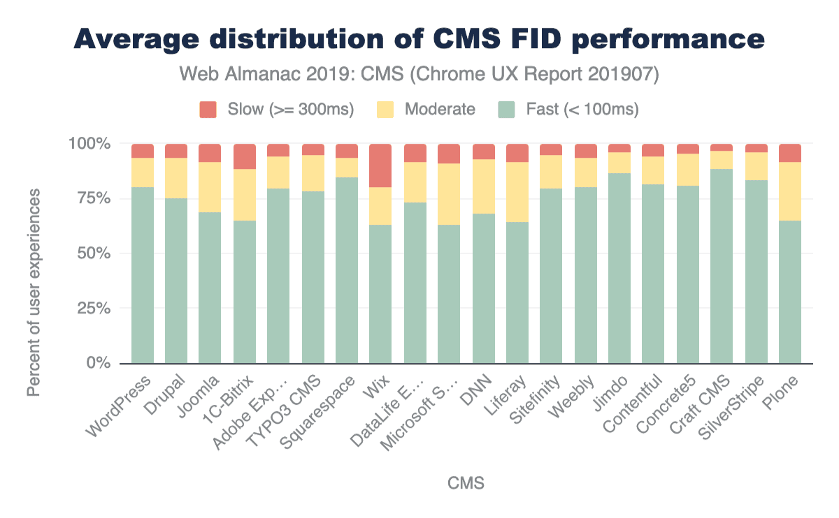 この差はFCPのデータにも見られますが、FIDではパフォーマンスに大きなギャップが見られます。例えば、Joomlaのモバイルとデスクトップの高速FCP体験の差は約12.78%ですが、FIDの体験では27.76%と大きな差があります。モバイルデバイスと接続品質が、ここで見られるパフォーマンスの格差に一役買っている可能性があります。以前に強調したように、ウェブサイトのデスクトップ版とモバイル版に出荷されるリソースにはわずかな差があります。モバイル(インタラクティブ)体験のための最適化は、これらの結果から明らかになります。