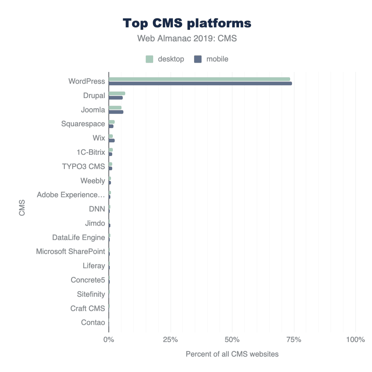 デスクトップとモバイルデバイスで提供されているウェブページを見てみると、何らかのCMSプラットフォームによって生成されたページとそうでないページの割合が約60-40%に分かれていることがわかります。