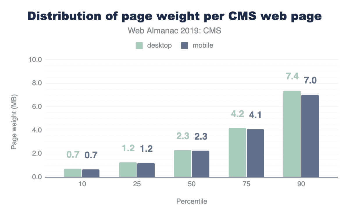 中央値は、すべてのCMSページが上か下かの中間点を示しています。つまり全CMSページの半分はリクエスト数が少なく、重量が少ないのに対し、半分はリクエスト数が多く、重量が多いということになります。10パーセンタイルではモバイルとデスクトップのページはリクエスト数が40以下で重量が1MBですが、90パーセンタイルではリクエスト数が170以上で重量が7MBとなり、中央値の3倍近くになっています。