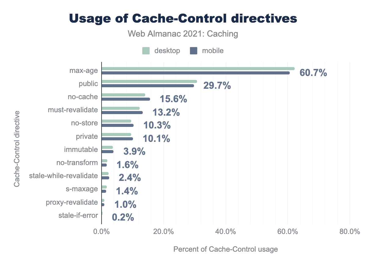 max-ageディレクティブはもっとも一般的で、62.2%のデスクトップ・リクエストがこのディレクティブを含む Cache-Control レスポンス・ヘッダーを含んでいます。