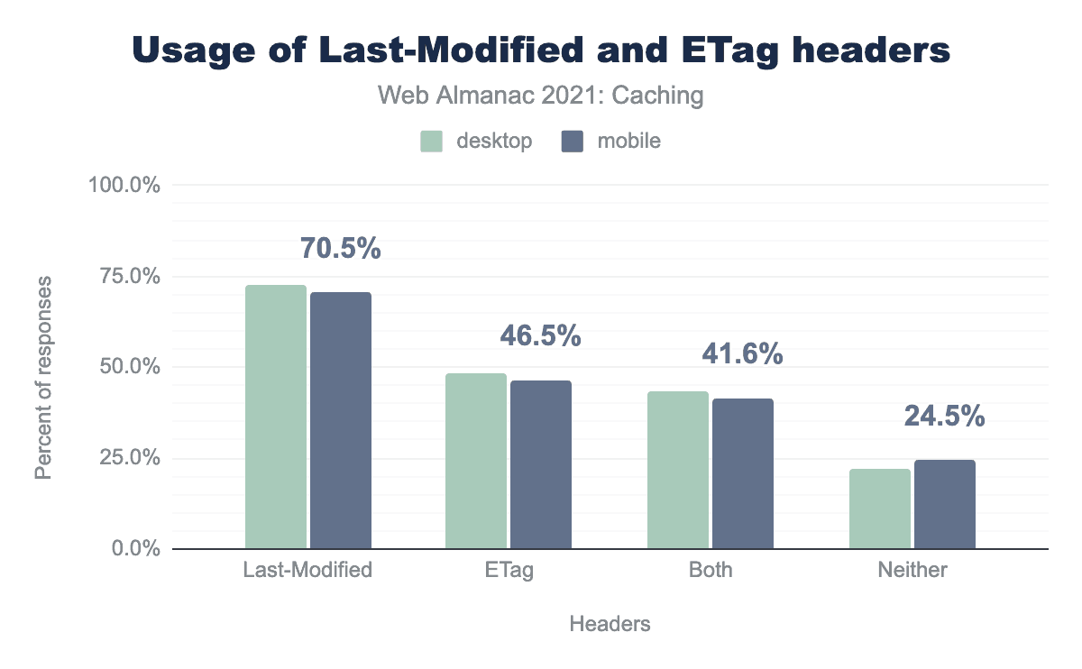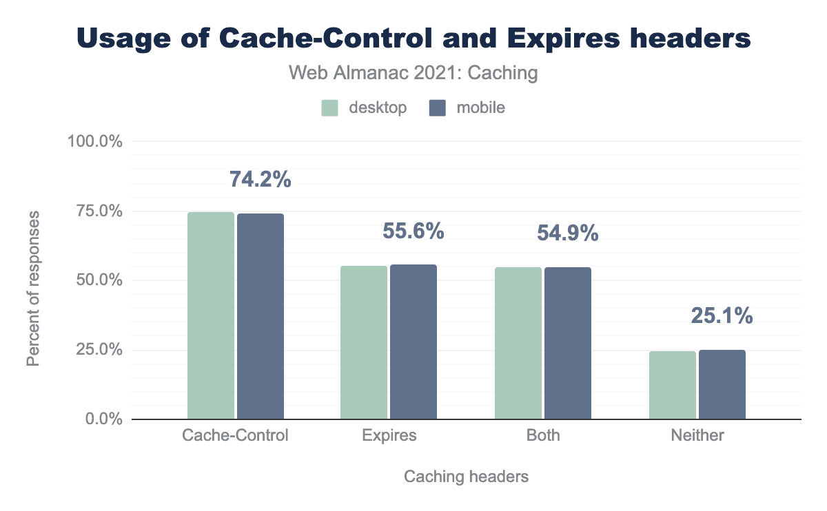2020年以降、この特定のヘッダーの使用率は、モバイルで0.71%、デスクトップでは1.13%増加しました。しかし、モバイルではまだ25.1%のリクエストが Cache-ControlExpires ヘッダーのどちらも使用していません。このことから、コミュニティでは Cache-Control の適切な使用に関する認識が高まっていると思われますが、これらのヘッダーを完全に採用するにはまだ長い道のりがあります。