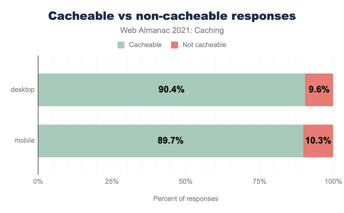 しかし、もっともよく使われるリソースの中には、動的な性質のためか、キャッシュ不可能なものがあります。とくに、HTMLは23.4% ともっとも高い割合でキャッシュ不可能なリソースがあり、画像は10.1% でそれに続いています。