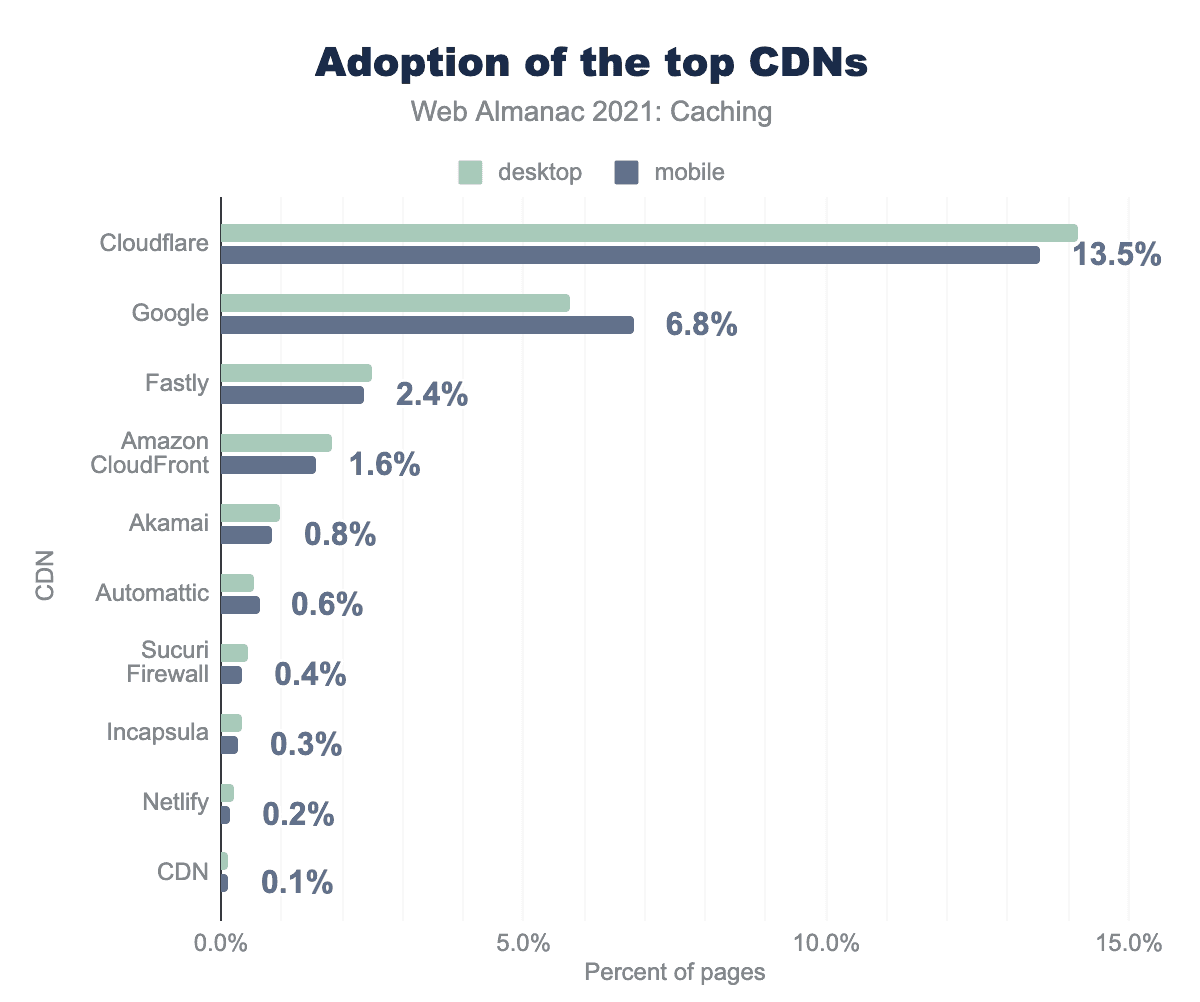 2021年のウェブ全体では、Desktopに使用されているCDNはCloudflareがもっとも普及しており、総ページ数の14%、次いでGoogleが6%となっています。CloudflareとGoogleがもっとも普及していますが、この2つ以外にも、Fastly、Amazon CloudFront、Akamaiなど、多種多様なソリューションが残っています。